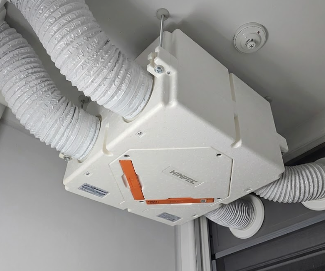 전열교환기란? 환기 시 나가는 열을 회수해 냉난방 효율을 지키며 공기를 순환시키는 장치입니다. 2006년 이후 건축된 100세대 이상 공동주택은 설치가 의무화되어 있으며, 신축 아파트 거주 중이라면 이미 설치되어 있을 확률이 매우 높습니다!